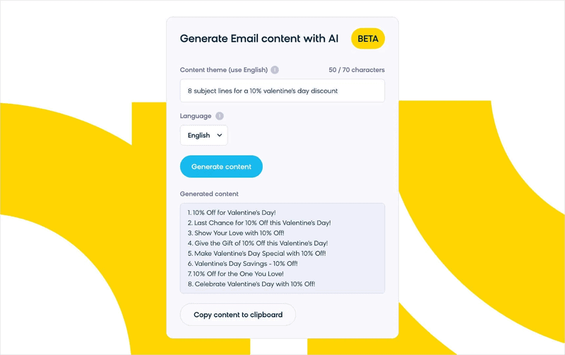 - Create a catchy subject line. Bloomreach Engagement has an AI content generator, which means you can quickly generate content ideas, create testing variants, try different tones of voice, and even support multi-language content to engage your audience.