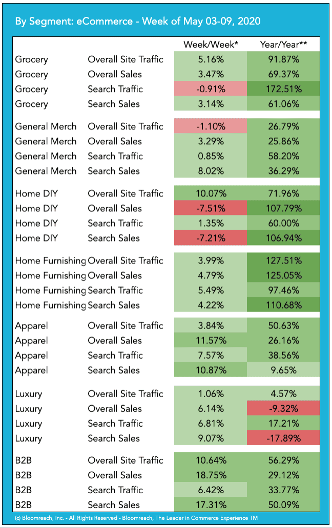 Bloomreach powers over 20% of US & UK eCommerce search and commerce experiences across the 300+ global enterprise businesses – many of whom have multiple brands and eCommerce sites. You can find all of Bloomreach’s Coronavirus related research, including previous weeks, on our Coronavirus Content Hub. If you have any further questions, I encourage you to reach out here, and we will follow up with you ASAP. We aim to bring you further insights each week as we navigate these challenges together – whether you are a customer or not.