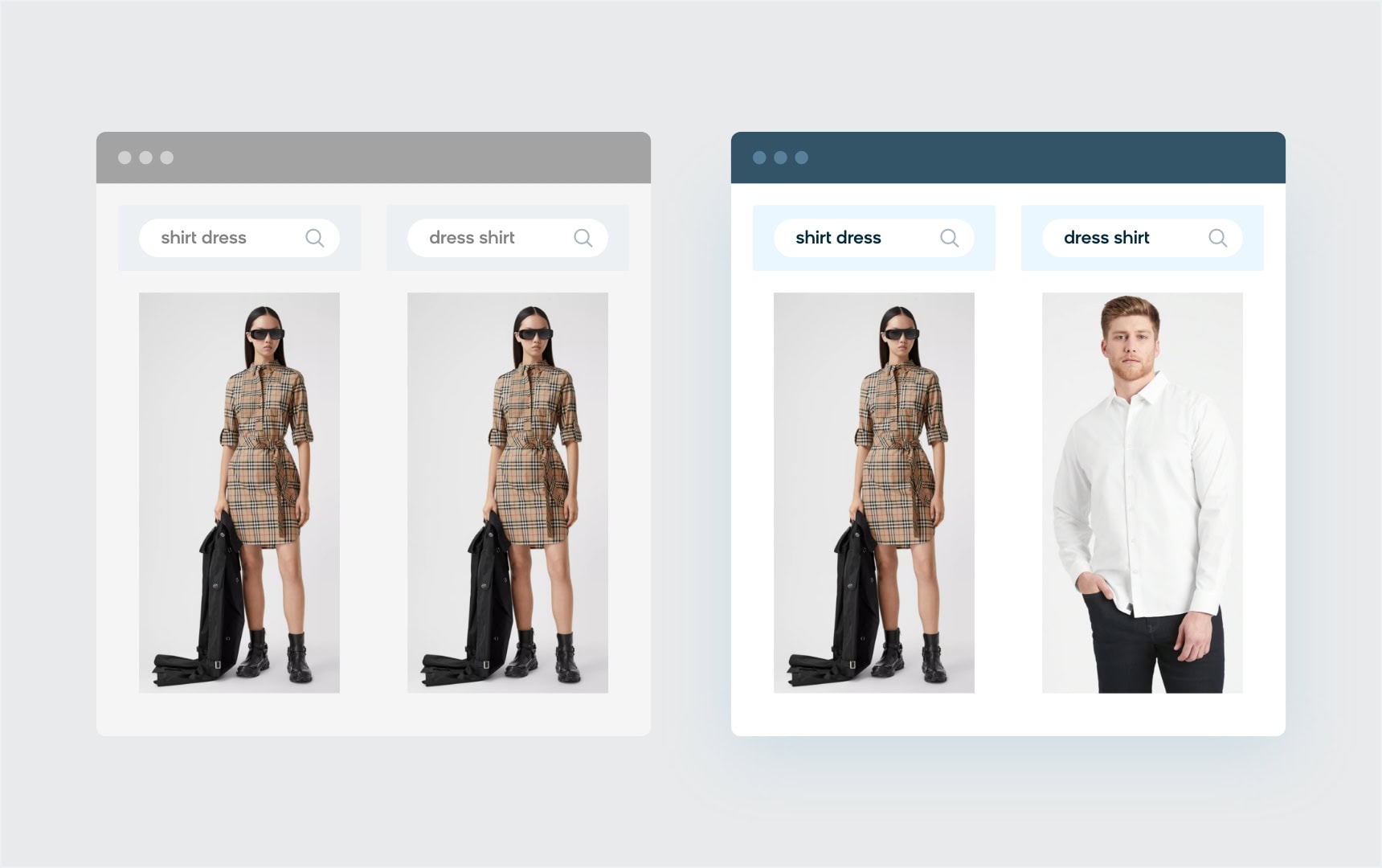 With this type of AI in place, your search results become comprehensive, seamless, and much more meaningful. Your results can respond to a user’s intent as opposed to simply matching keywords to web pages — like knowing the difference between a “shirt dress” and a “dress shirt,” for example.