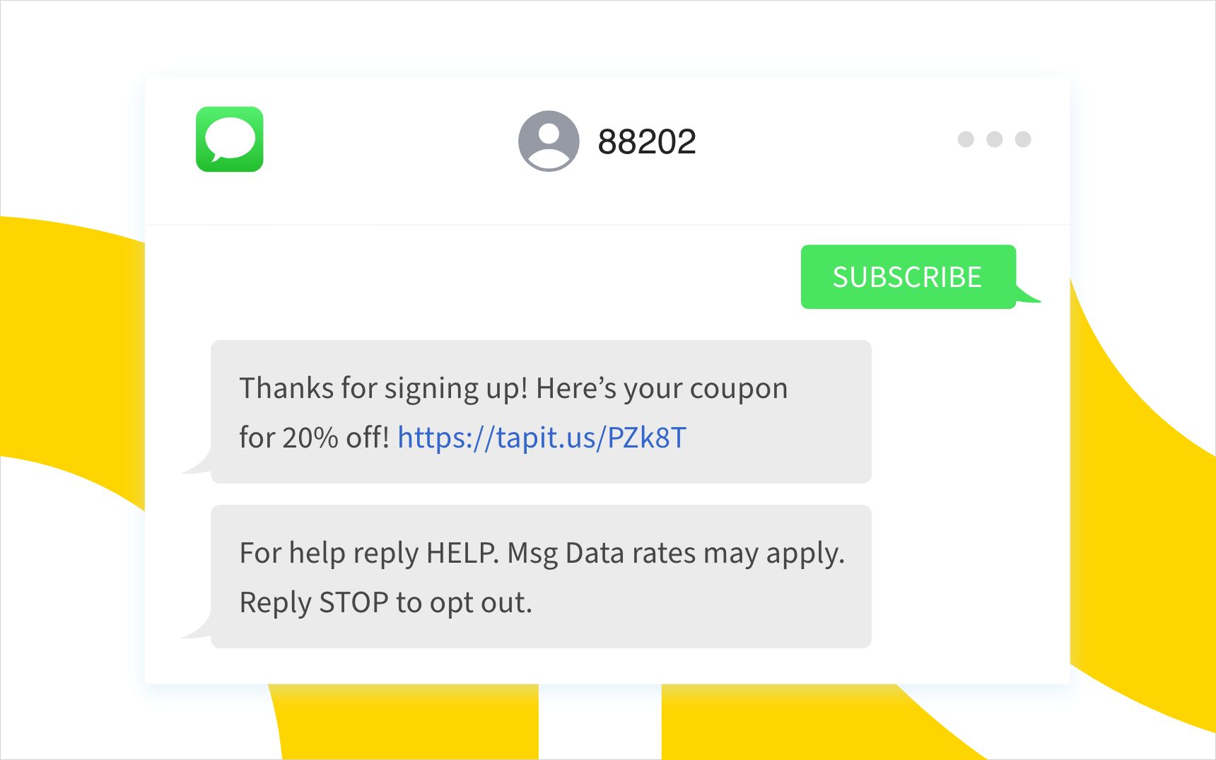 If it’s the first message you send after they’ve given you written permission to send marketing text messages, you can thank them for subscribing, set expectations for message frequency, link to terms and conditions, and ask them to reconfirm their opt-in status by asking for a simple reply of “Yes” or “No.”
