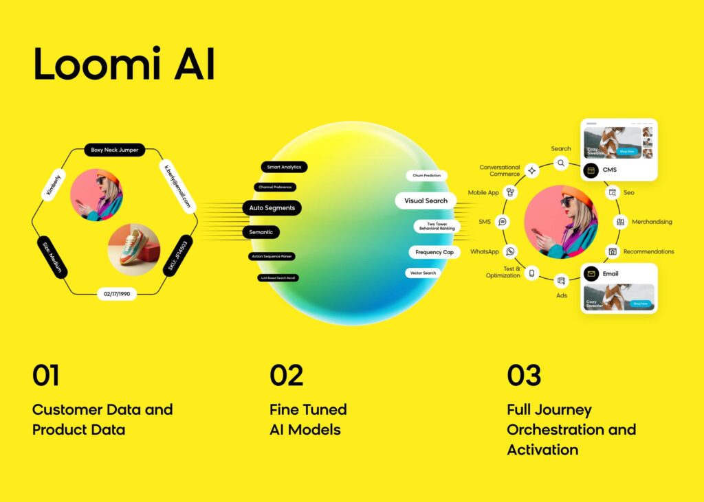 Acting as the connective tissue between all your touchpoints, Loomi AI analyzes real-time customer behavior, product attributes, intent signals, and channel preferences to personalize every interaction — from marketing campaigns and triggered messages to search results, recommendations, and on-site content.