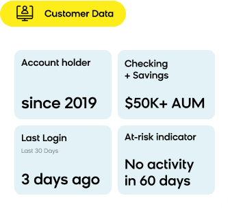 - Recover at-risk customers – Bring back inactive depositors or lapsed cardholders with personalized win-back offers