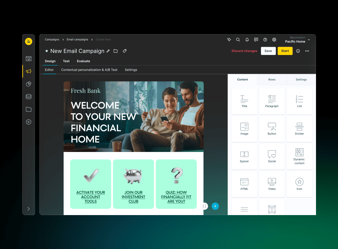 Bloomreach's drag-and-drop email marketing solution excels for finance marketers because it automatically integrates with account data, transaction history, and customer lifecycle signals to create personalized recommendations within your email design. Our email builder includes elements like dynamic recommendations blocks, and AI-powered content that adapts to each customer's interests and buying patterns. This drives measurable results — financial services customers like Raisin achieve significant improvements in onboarding conversion rates, cross-sell revenue, and customer activation through real-time, compliant personalization.