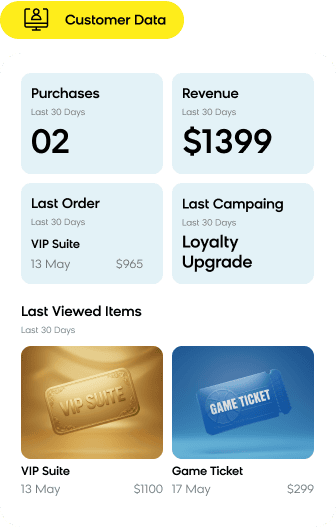 Unify all your fan data in a single platform. From ticket purchases to merchandise preferences, get a complete view of each supporter, and use this data to power relevant marketing content across email, SMS, web, and app.